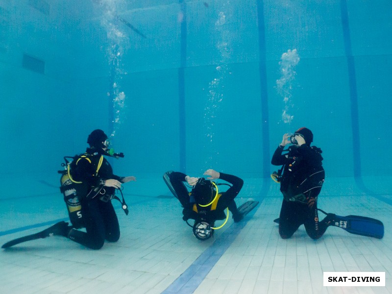 Ишуткина Наталья, Кирюхин Роман, Курбакова Елена, прозрачность воды в бассейне в это время фантастическая. Поднимающиеся к поверхности пузыри воздуха представляют собой захватывающее зрелище