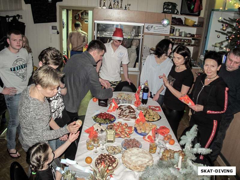 Не успел клуб остыть от вечеринки 30 декабря, как пришло время готовиться к встрече самого Нового года. К тем украшениям, что уже были в клубе добавилась небольшая елочка с парой ярких гирлянд. Установлена она была в колбу баллона, как и положено в подводном клубе. Также на площадке перед клубным входом был зажжен костер и установлен мангал для приготовления рыбы. В тот момент, когда куранты начали отбивать последние секунды уходящего года, все дайверы в снаряжении попадали в воду с бортиков и отправились к елке на дне. Чтобы вместе встретить первые мгновения Нового года под водой. Потом было дружное застолье у стола, который того и гляди норовил треснуть от множества предложенных угощений. Ведь все принесли еще и что-то с собой: консервации, торты, картошку, конвертики из блинов, да чего там только не было. Запомнится надолго и ночь у костра людей в плавках с колпаками на голове, где еще такое увидишь. Спасибо всем, что были с нами, мы даже не ожидали, что вас может собраться так много…