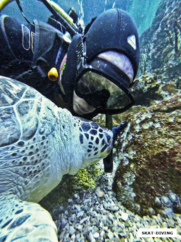 В дикой природе черепахи тоже парой подпускают близко к себе, но такой контакт, как в океанариуме, все равно редкость