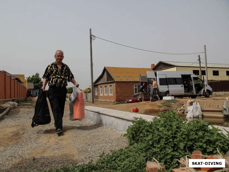 Врублевский Юрий, помогает погружать снаряжение в лодки у причала