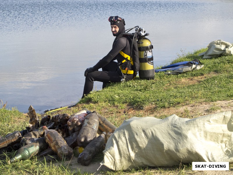 Шукста Игорь, пока подводники собирали мусор, Игорь собирал грибы прямо у воды